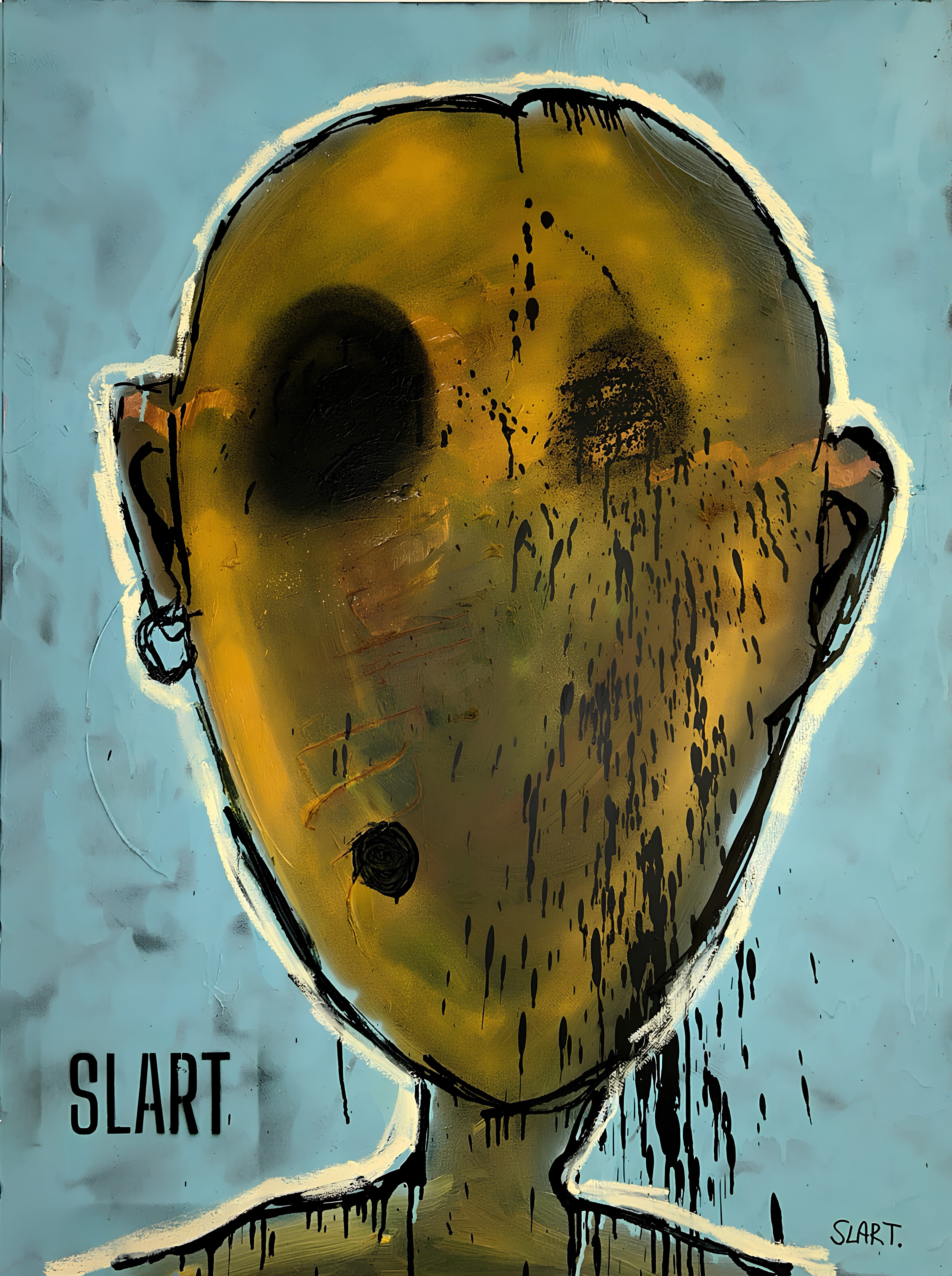 "Memento Vivere," a painting by SLART, is inspired by the Stoic idea of Memento Mori, which means "remember you must die." Instead of focusing on death, this artwork encourages us to "remember to live." It features a striking abstract figure with a large, textured head and vivid facial markings that express the intensity and complexity of life.