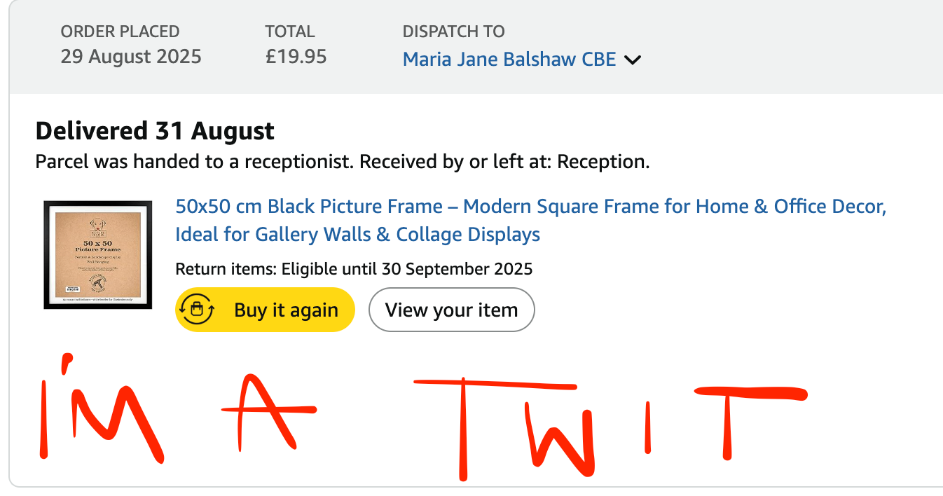 I made quite a funny cock-up because I sent items to Maria Balshaw, Director of the Tate, to get her attention for Memento Vivere, but this time I ordered a frame myself and sent it to her by accident. I was pissed off at first, but I had to laugh, as it would be more of a hassle trying to get it back. Maybe it's the thing that will get her attention; perhaps the Tate Modern will use it as conceptual art.