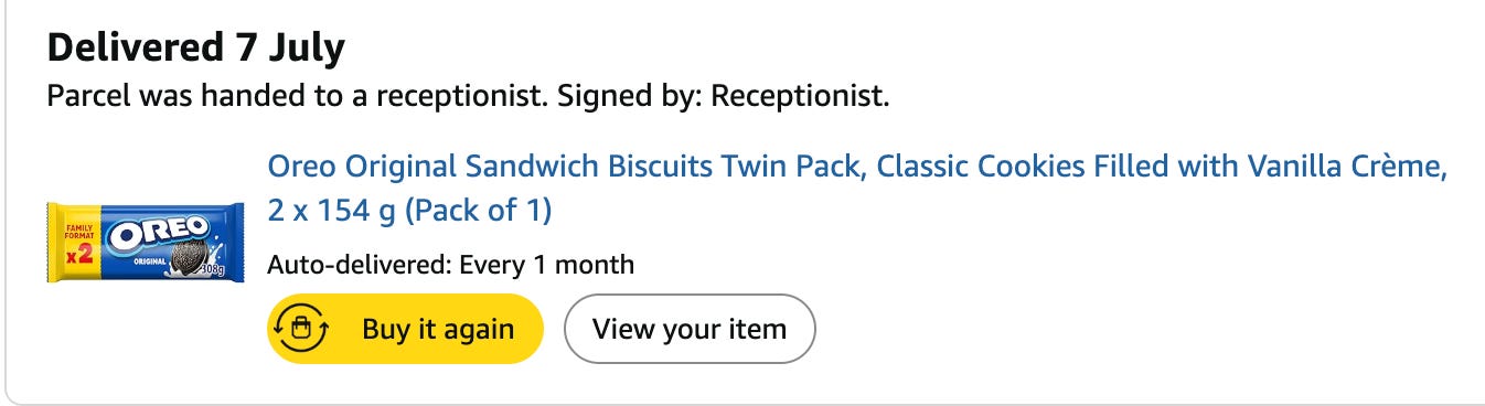 It appears I’ve set up a monthly shipment of Oreos to Adam Buxton and Edith Bowman by accident. Oops. I wonder if they’ll ever see the message or get to enjoy the biscuits?